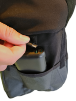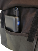 V zadní vnější části vaku se nachází kapsa, do které zasuňte powerbanku. V horní části připojte integrovaným konektorem do zdířky usbC2, což automaticky aktivuje powerbanku.