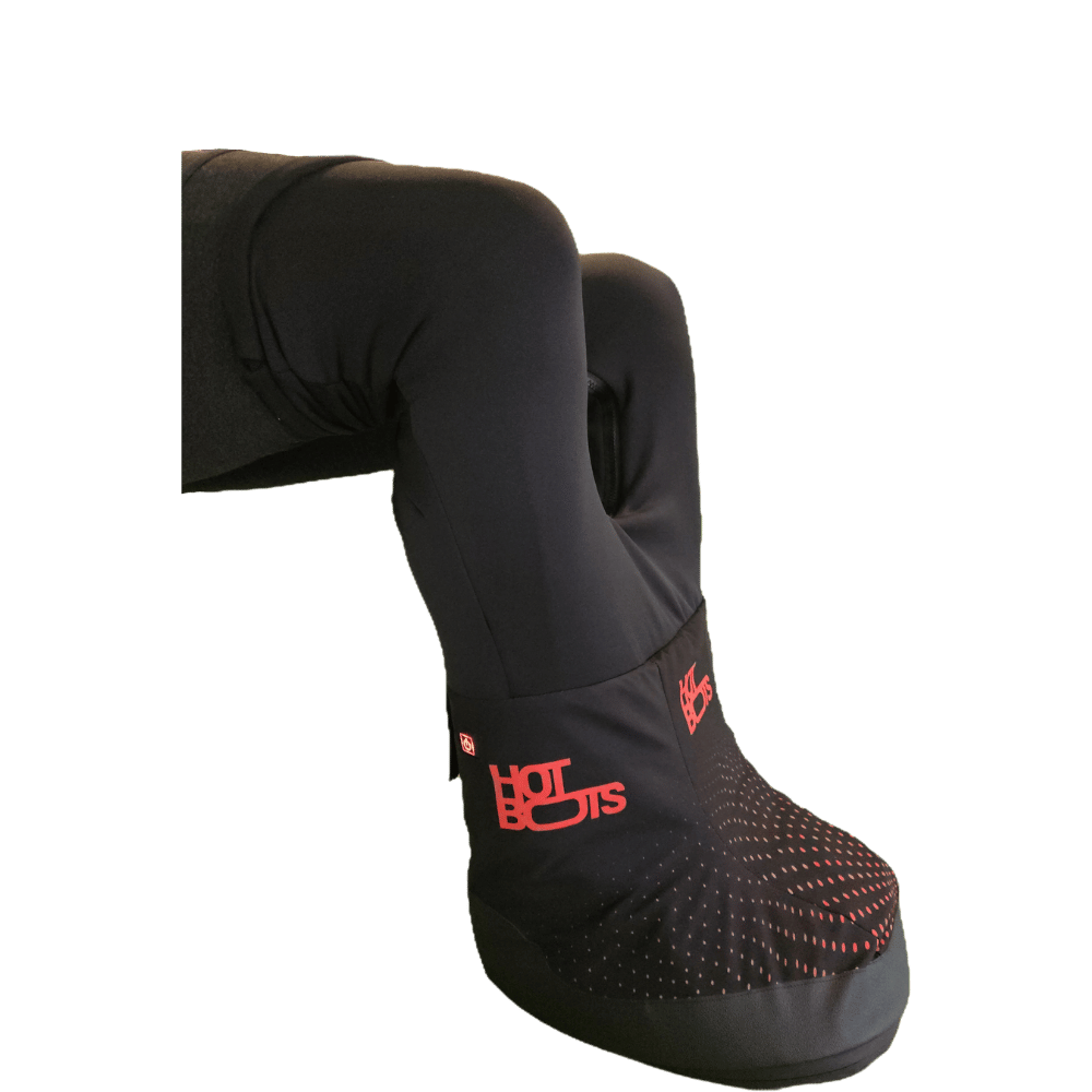Vak položte na zem, odkryjte návlek a vložte obě nohy do vaku. Hotboots je možné používat v jakékoliv obuvi, případně bez obutí. Poté vytáhněte levou část návleku nad kolena a v oblasti stehna zapojte zip. Celý návlek zipem uzavřete plynulým přejetím na pravou stranu. Vak je kompletně nasazen, pokud jsou obě části návleku vypnuty až k oblasti stehen.